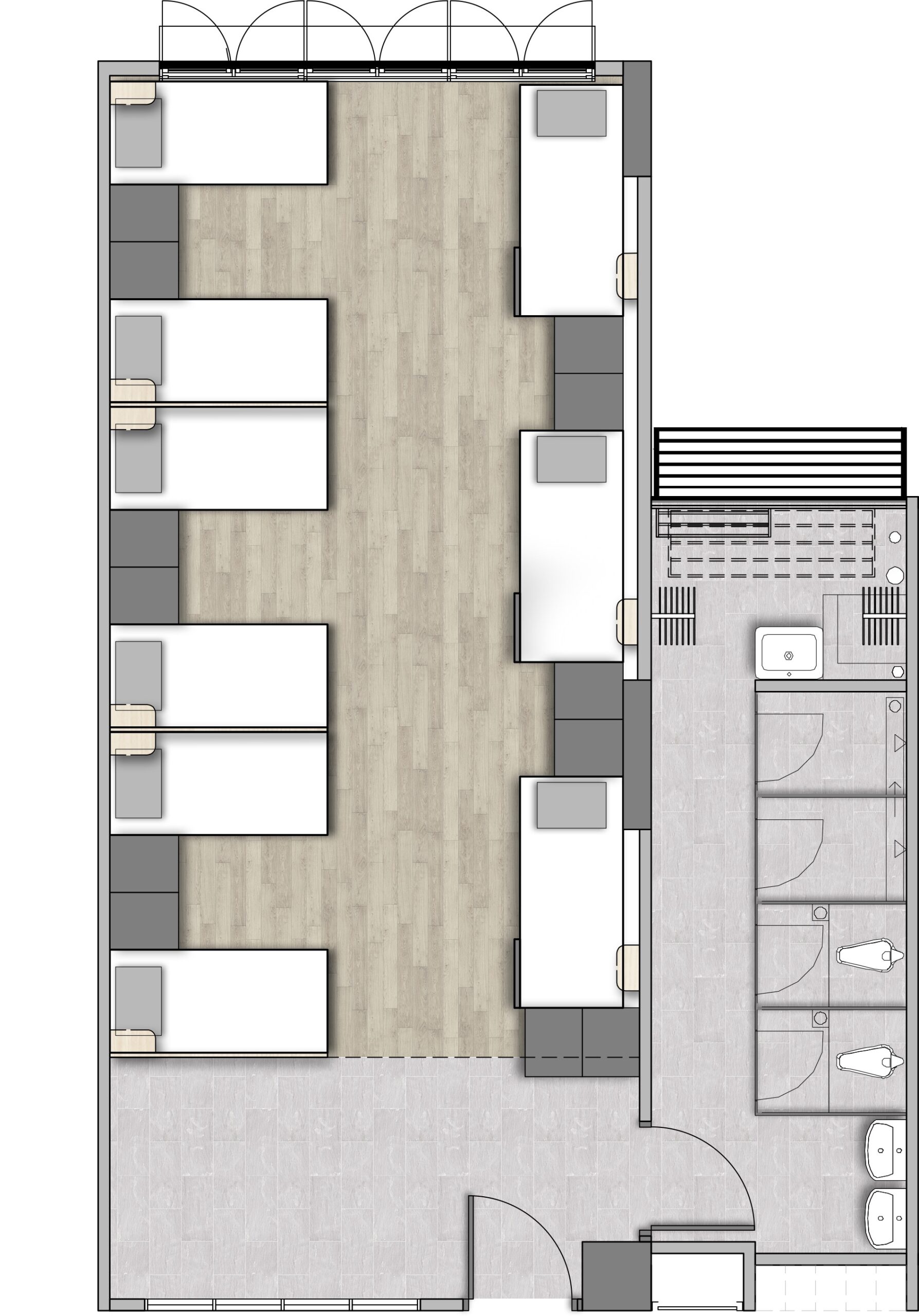Tukang Dormitory is designed with thoughtful features to support both pandemic management and the everyday social, personal, and living needs of migrant workers. Key room features include: